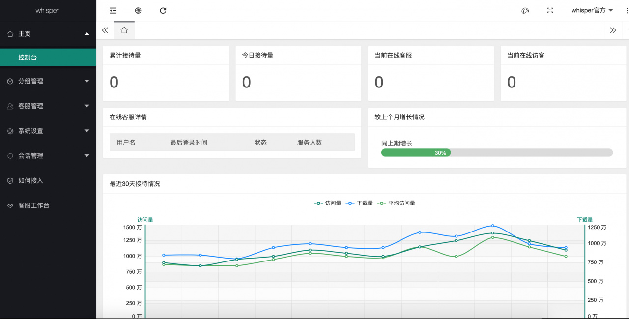 whisper是一个在线,您只需要添加一段简单的js 代码,就可以使您的网站拥有客服功能。