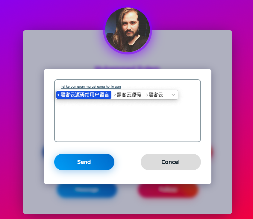 js基于css3属性制作社交博客网站个人信息卡片UI布局代码。点击弹出发送信息页面代码。