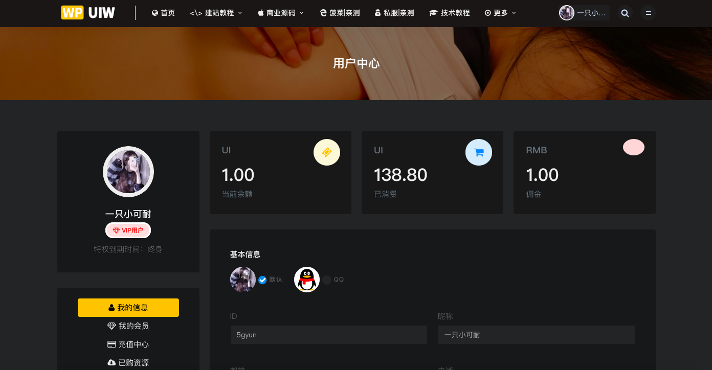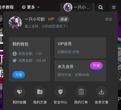 右上角登录后下拉菜单: