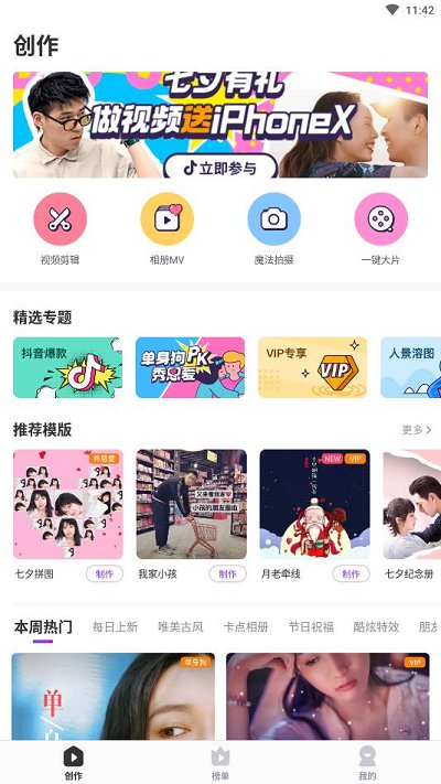 一款能让你一键制作网红小视频的神器,这里有大片效果、网红快闪、创意表白、趣味搞笑类模板,海量视频模板任你选。你只要简单替换图片文字,10秒变身朋友圈网红。无需专门取景、无需后期编辑、即拍即得,你也可以成为各种社交场景的焦点!