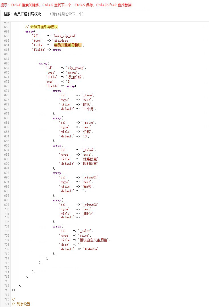 一、首先修改ripro/inc/codestar-framework/options目录下options.theme.php文件 找到660左右的// 会员开通引导模块或直接全局搜索“// 会员开通引导模块”, 一直到 // 列表设置 全部替换成附件中“options.theme.php”文件内的内容!