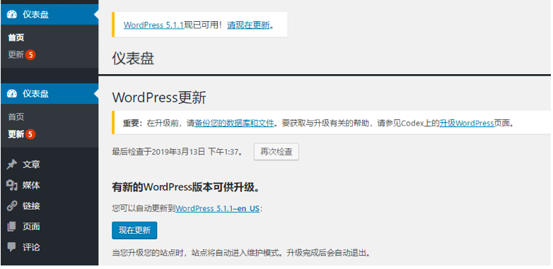 当有新的Wordpress版本出现时,网站后台就会有升级提醒,只要点击进去,点击“现在更新”就可以了。