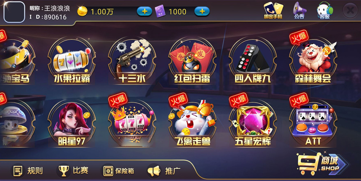 百人场:森林舞会、五星宏辉、龙*斗、百*乐、水果机、飞禽走兽、ATT、明星97、老*机、奔驰宝马、骰*、俄罗斯轮盘、红黑大战、龙凤对决、万人牛牛